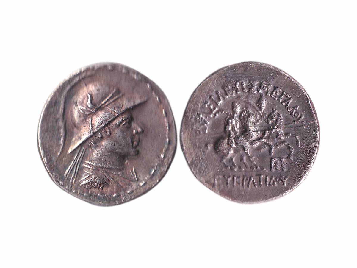 Indo-Greeks, Eucratides I (c. 171-145 BC), Silver Tetradrachm, 16.48g, Monolingual Series, Obv: Diademed bust of king facing to right, wearing crested helmet adorned with ear and horn of bull, Rev: Mounted dioscuri holding palms and spear prancing to right side, Greek legend split in two lines 'BASILÖS EYKPATIDOY'. (Bopearachchi & Rahman # 242). Extremely Fine. Very Rare.