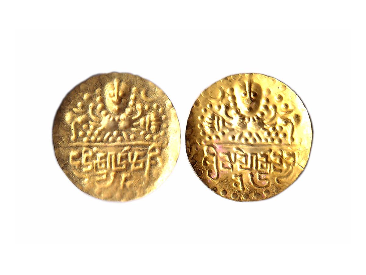 Sharabhpurias of Chhatisgarh, Mahendraditya (c. 6th century AD), Gold Dinar, 1.24g, Repousse and bracteates, Obv:Garuda flanked by shankha and charka, with box-headed Brahmi legend 'Sri Mahendraditya', around dotted circle, Uniface, Broad flan. (Sanjeev Kumar, TGE, Class I, Variety B). Extremely Fine. A very rare ruler as compared to Prasannamatra of the Sharabhapurias. It is suggested by A M Shastri that these coins were struck by Narendra, the Sharabhapuriya king, nominally acknowledging the Gupta emperor Kumaragupta III.