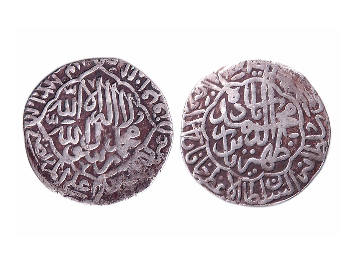 Babur (AH 932-937 / 1526-1530 AD), Silver Shahrukhi, 4.54g, Mintless type, Probably struck at Kabul, Kalima within quatrefoil with four knots on obv., ruler name and mint within scalloped enclosure on rev. Very Fine.
