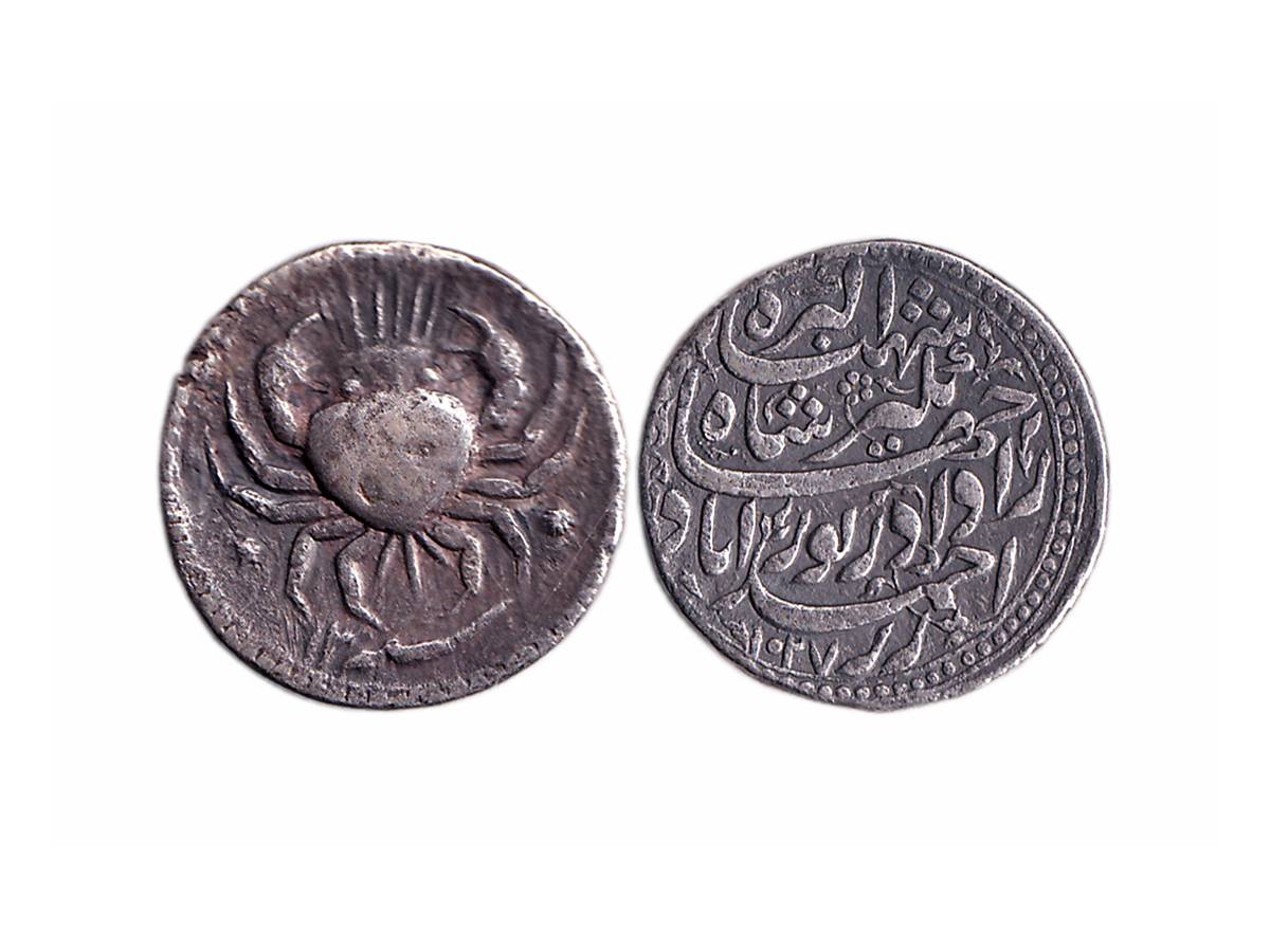 Jahangir (AH 1014-1037 / 1605-1627 AD), Silver Zodiac Rupee, 11.00g, Cancer Sign, Ahmadabad Mint, RY 13, Obv: A crab emerging from the sun flanked by stars, Rev: Persian couplet 'Zar-i Ahmadabad ra dad zewar Shah Jahangir Shahenshah Akbar'. (KM # 150.10). Extremely Fine+.