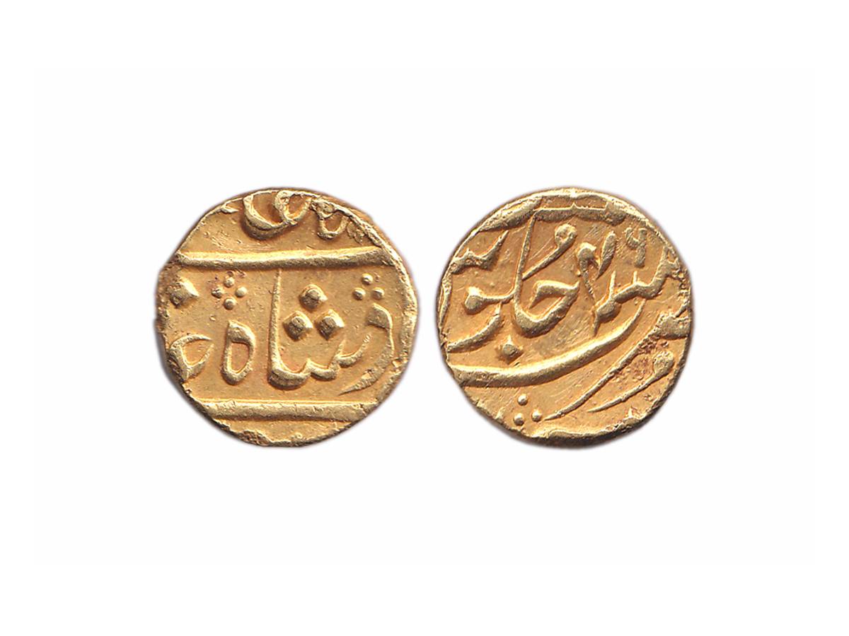 Bombay Presidency, Surat Mint, Gold Mohur (15 Rupees), 11.57g, in the name of Shah Alam II, RY 46 (KM # 214). Very Fine+.