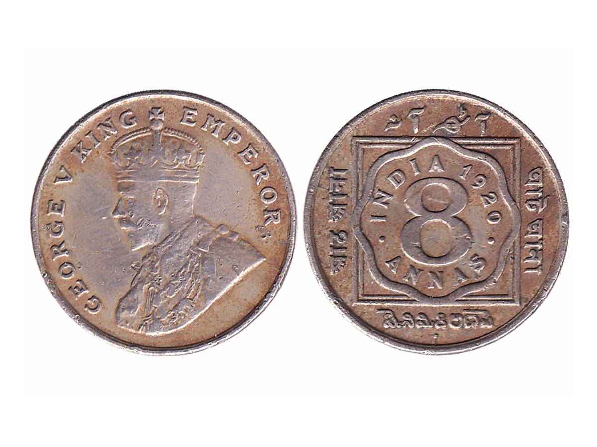 George V, Copper Nickle 8 Annas, 7.76g, 1920 Bombay Mint, Dot. (GK # 1079). Very Fine+.