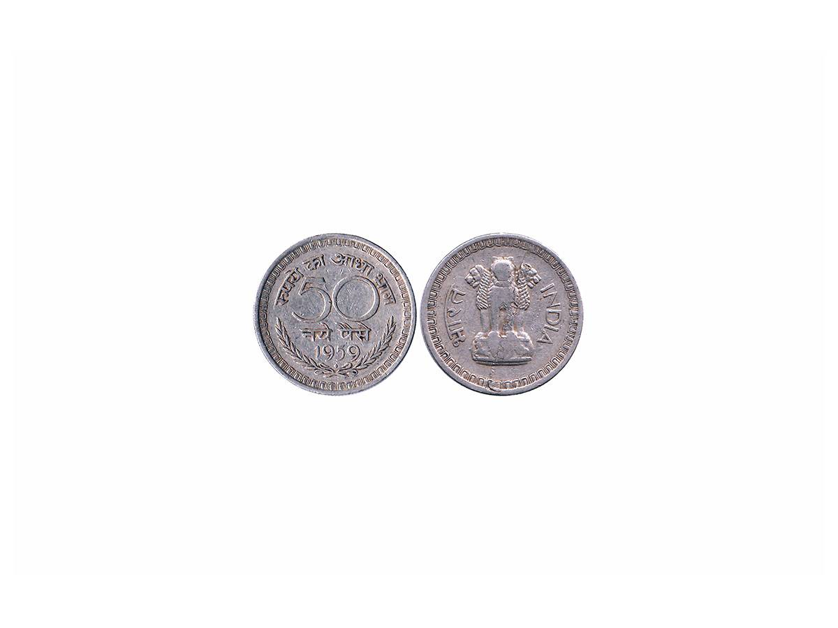 Republic India, Copper-Nickel, 50 Paisa, Rupaye ka Aadha bhag, 50 Naye Paise,1959, Bombay Mint on obv., Ashoka pillar on rev. Very Fine+. Extremely Rare.