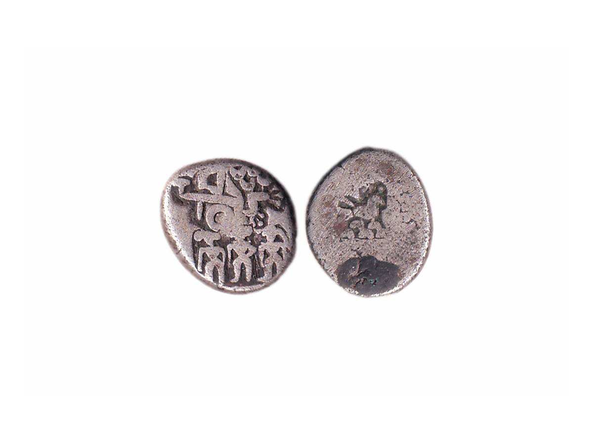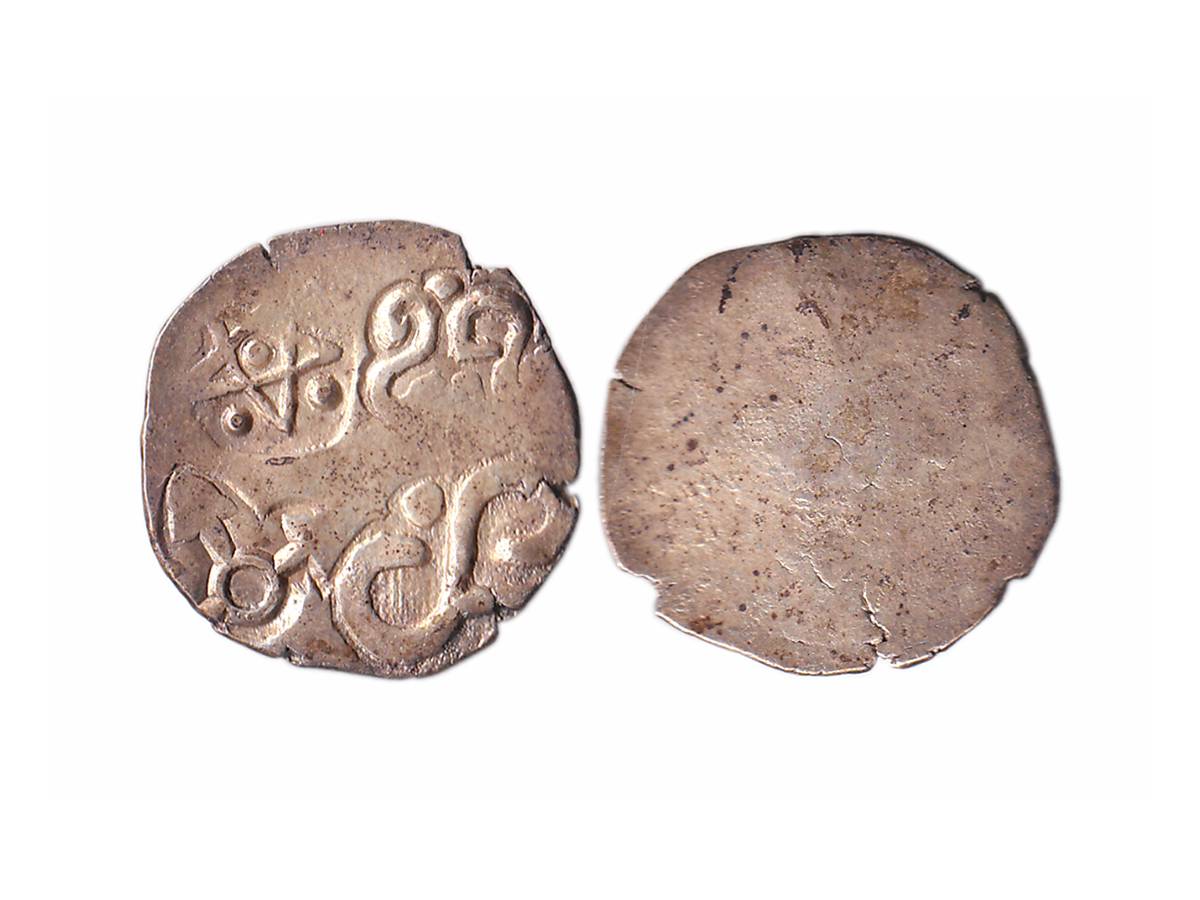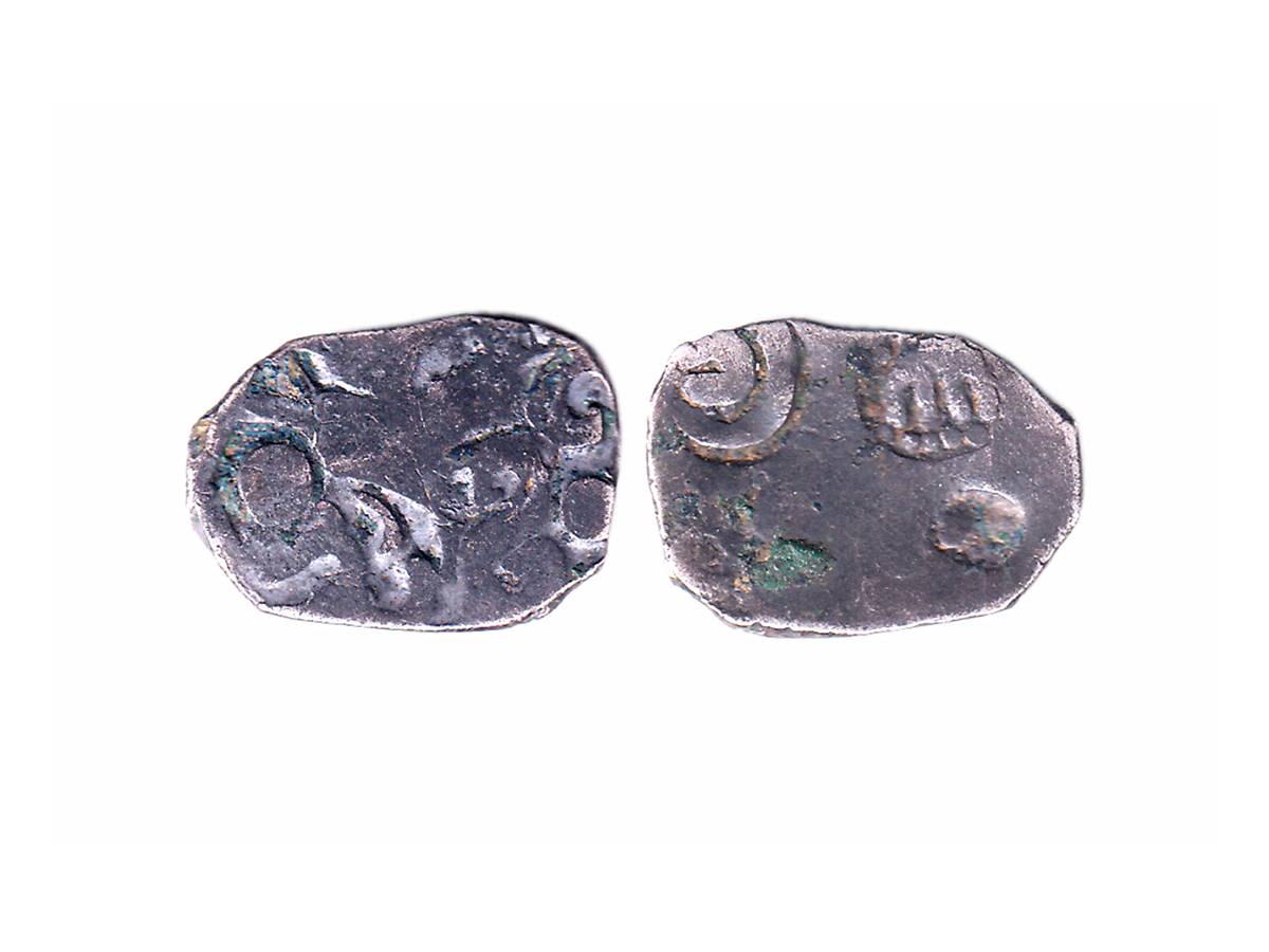 Archaic Coinage, Punch Marked, Imperial Mauryan Series (c. 250-200 BC), Patna Region (Bihar), Silver Karshapana, 3.15g, G/H Series VII, Obv: Three human figures as a single punch, Peacock on three arched hill and balance symbol, Rev: Peacock on three arched hill as a banker mark. (Gupta & Hardaker # 591). Fine+....