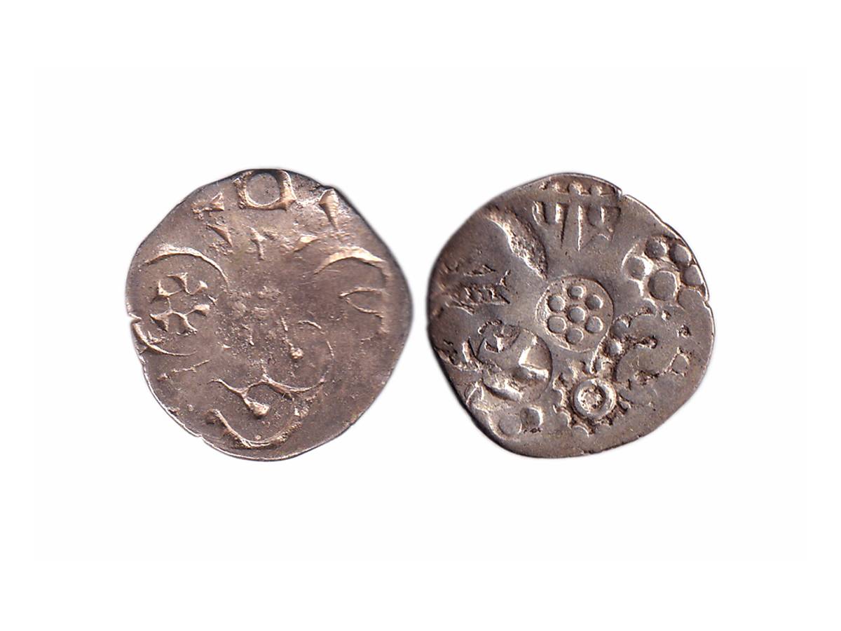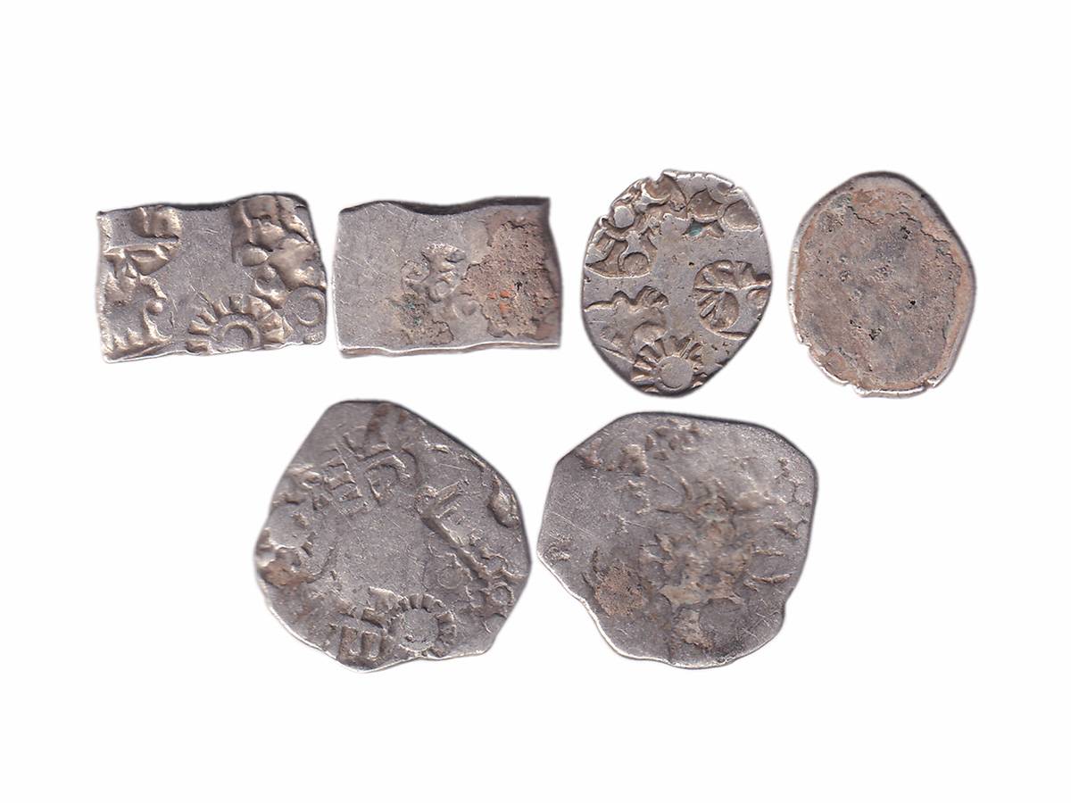 Archaic Coinage, Punch Marked, attributed to Gandhara Mahajanapada (c. 600-350 BC), Kabul Region (Afghanistan), Silver ¼ Shatamana (2), Obv: Six armed symbol, Uniface. (Rajgor # Series 41). Very Fine+. (2)...
