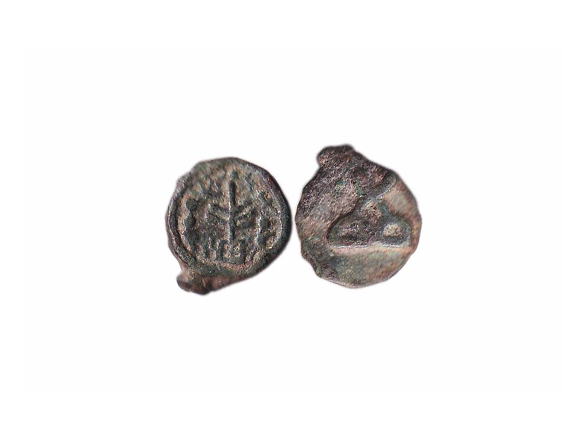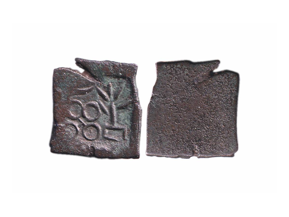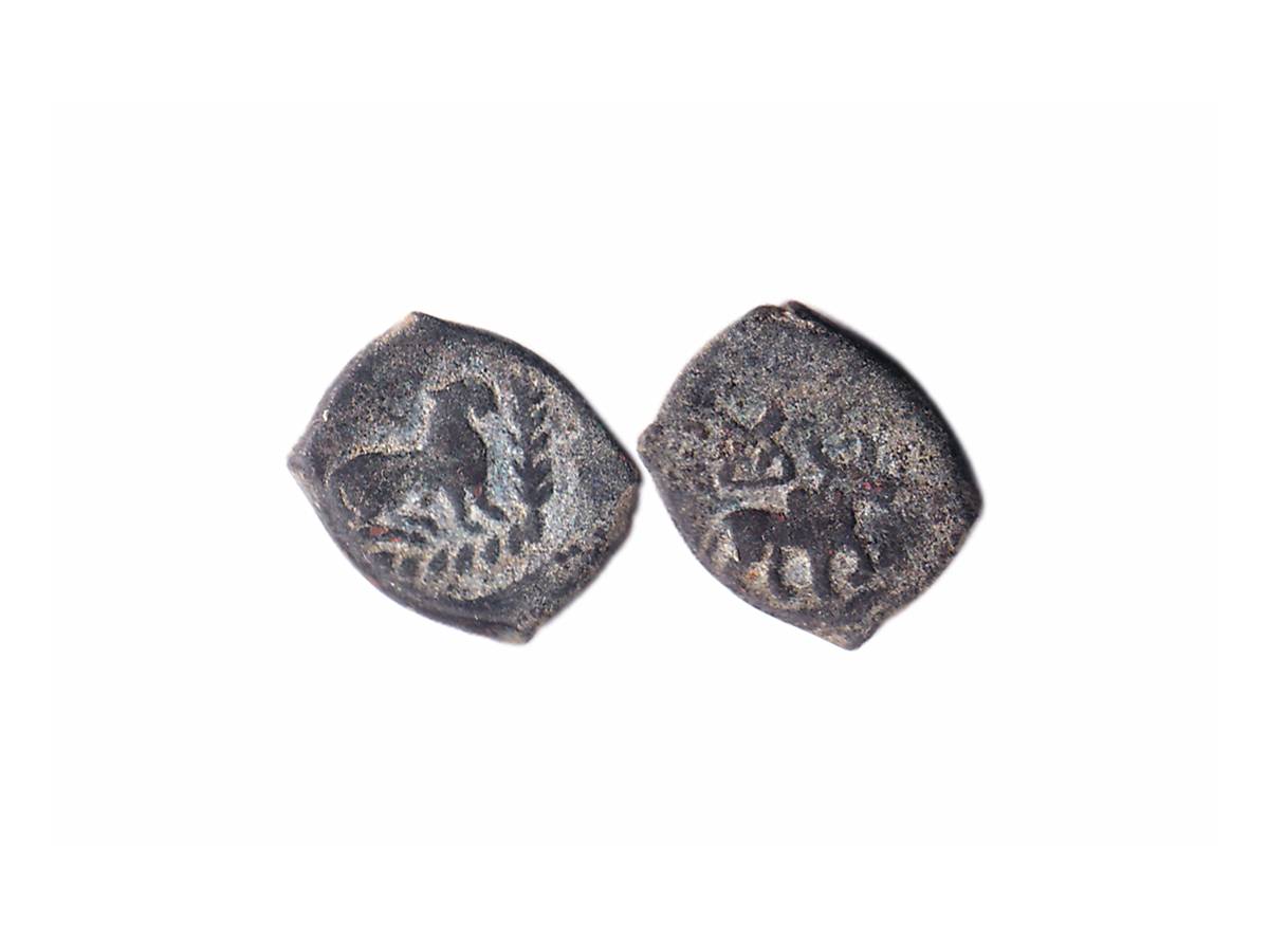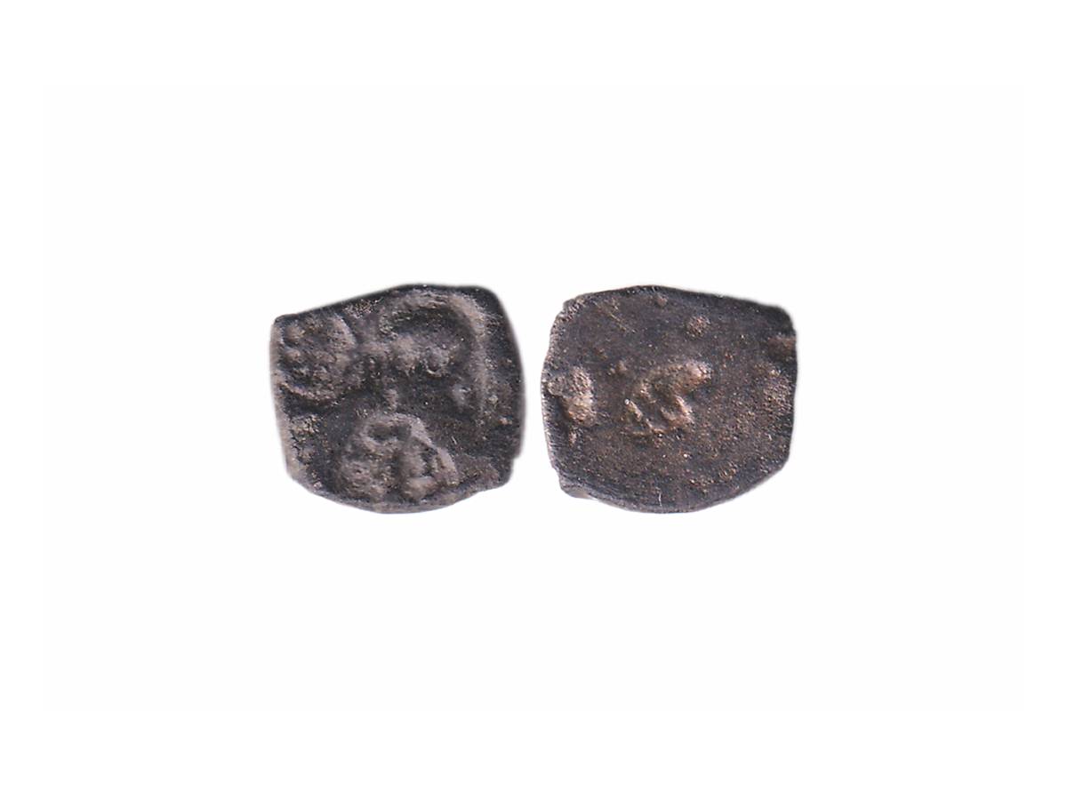Post-Mauryan (c. 200-150 BC), Taxila Region, Uninscribed type, Cast Copper, 1.75g, Obv: Tree-in-railing, on left top three arched hill with crescent, taurine indradhvaja and flanked by human figure, Rev: Three arched hill above crescent. (Pieper # 346). Very Fine....