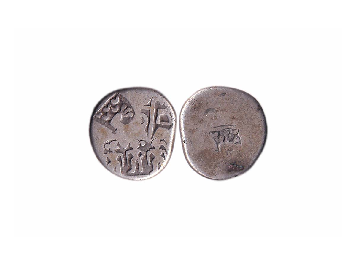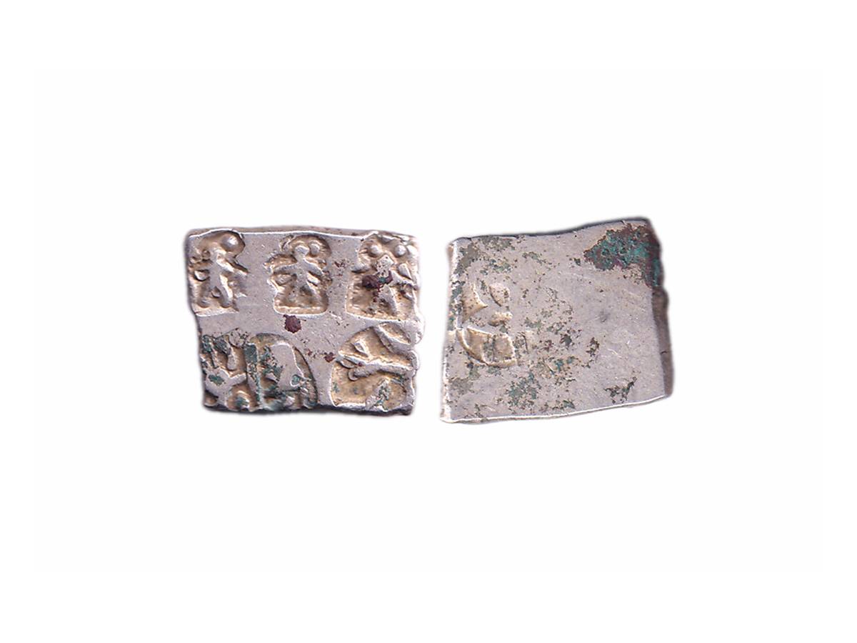 Archaic Coinage, Punch Marked, Imperial Mauryan Series (c. 250-200 BC), Patna Region (Bihar), Silver Karshapana, 3.34g, G/H Series VII, Obv: Three human figures as a single punch, Peacock on three arched hill and balance symbol, Rev: Peacock on three arched hill as a banker mark. (Gupta & Hardaker # 591). Very Fine....