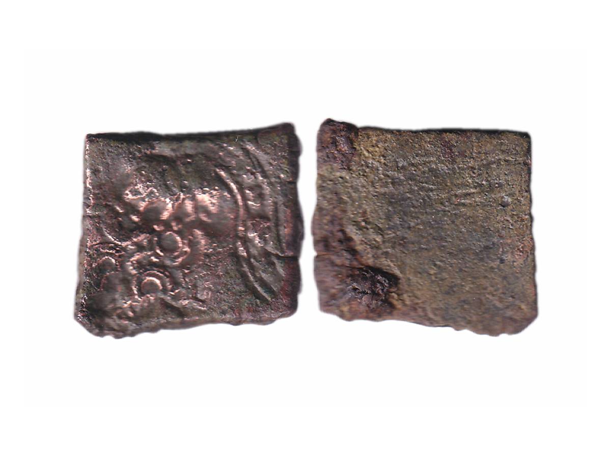 Post-Mauryan (c. 200-150 BC), Narmada Valley, Central India, Punch Marked type, Copper Unit, 4.81g, Obv: Four orbed ujjaini symbol on left and tree-in-railing on right side, Rev: Blank. (Pieper # 479). Fine +....