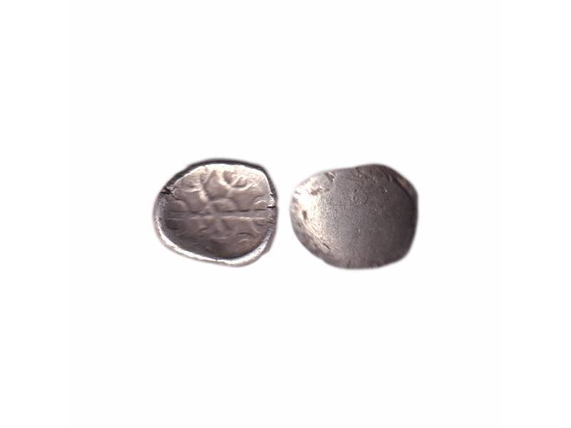 Archaic Coinage, Punch Marked, attributed to Kashi Mahajanapada, Varanasi Region (Uttar Pradesh), Silver Karshapana, 3.96g, Obv: Geometric symbol twice with other ancillary symbol, Uniface. Unlisted in Rajgor. Very Fine+.