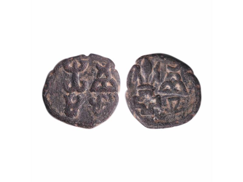 Post-Mauryan, Taxila Region, Uninscribed type, Cast Copper, 1.75g, Obv: Tree-in-railing, on left top three arched hill with crescent, taurine indradhvaja and flanked by human figure, Rev: Three arched hill above crescent. (Pieper # 346). Very Fine.