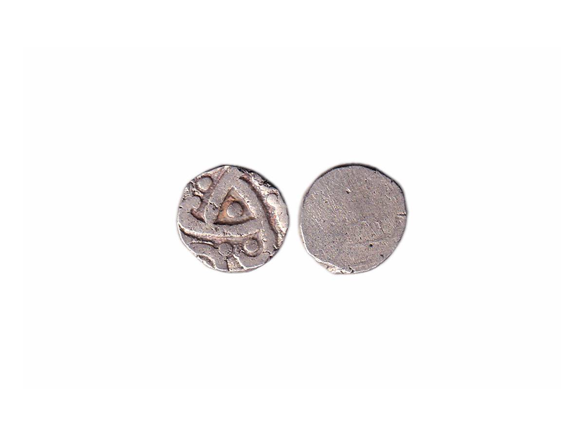 Archaic Coinage, Punch Marked, attributed to Kuru Janapada (c. 500-450 BC), Silver 1/2 Karshapana, 1. 60g, Babyal Hoard type, Obv: Triangular with dot in orb Surrounding taurine symbol, Rev: Blank. (Rajgor # Series 21). Very Fine+.