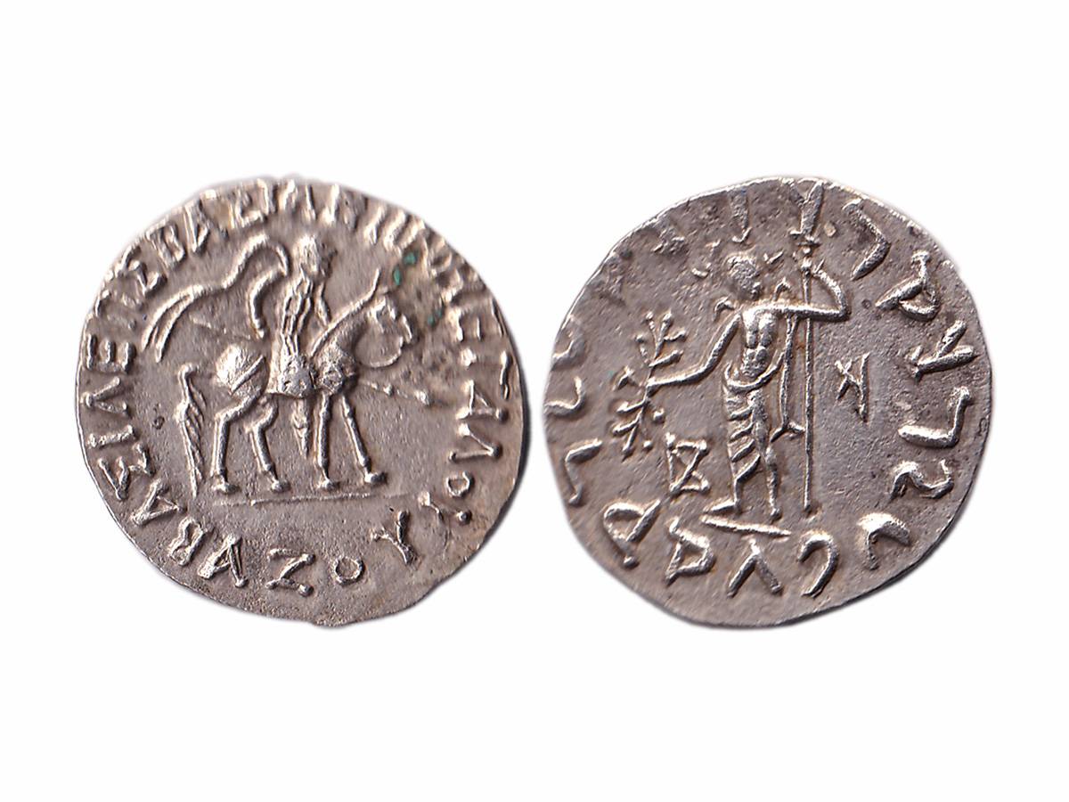 Indo-Scythians, Azes I (c. 57-35 BC), Silver Tetradrachm, 9.39g, Obv: King holding spear, mounted on horse waking to right, around Greek legend 'BASILEOS BASILEON MEGALOY AZOY', Rev: Zeus standing facing to left, holding long sceptre in left hand and thunderbolt in right hand with Kharoshthi legend 'Maharajasa rajarajasa Mahatasa Ayasa'. (Bopearachchi & Rahman # 718). Extremely Fine+.