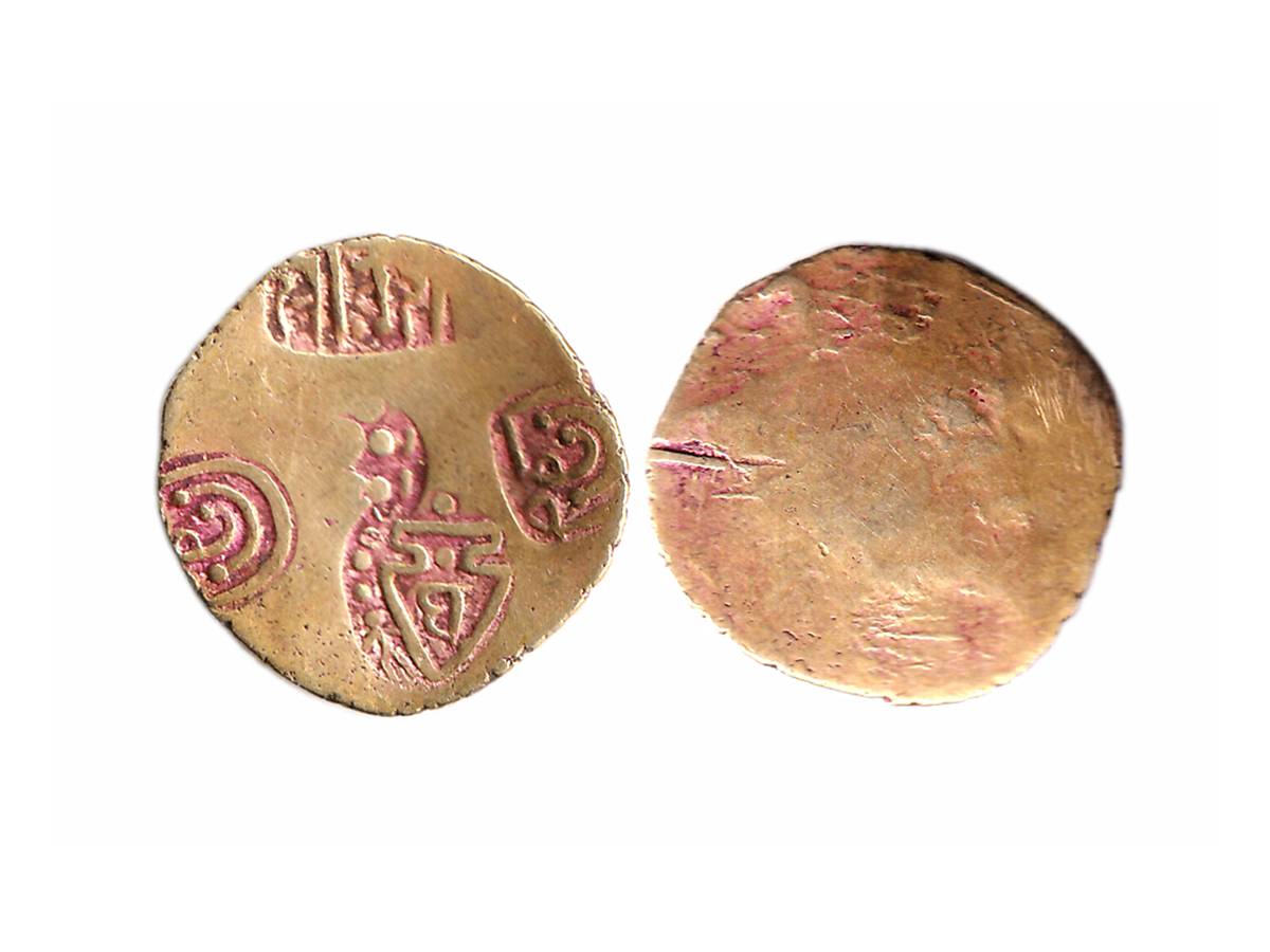 Feudatories of Paramaras of Vidarbha, Sri Vesabha (c. 12th century), Gold Pagoda, 3.49g, punches of a lion in centre, temple showing a human being, probably Shiva, 'Sri Vesabha' in Nagari and two punches of a geometrical D shaped design on obv., uniface. (Bankar & Somkuwar # JONS no. 200). Extremely Fine. Very Rare