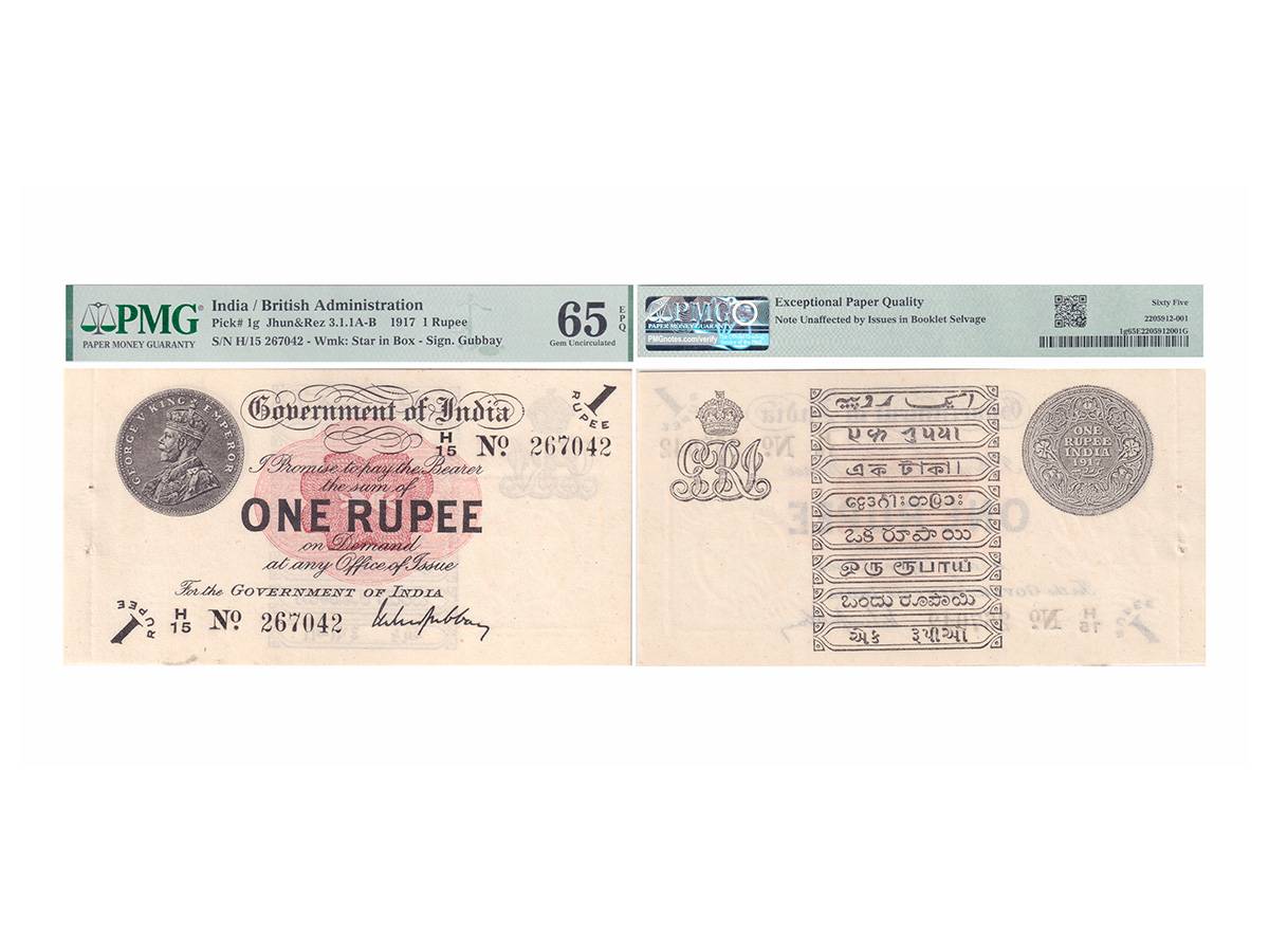 George V, 1 Rupee, 1917, Signed by M.M.S. Gubbay, (RR & KJ # 3.1.1A-B), Serial No. H15 267042. Graded by PMG, Gem UNC 65 EPQ.