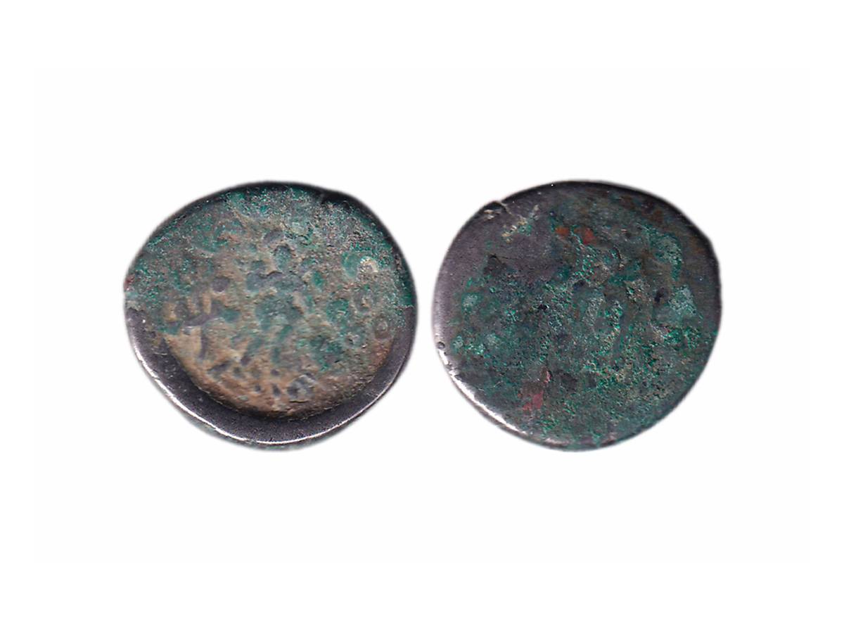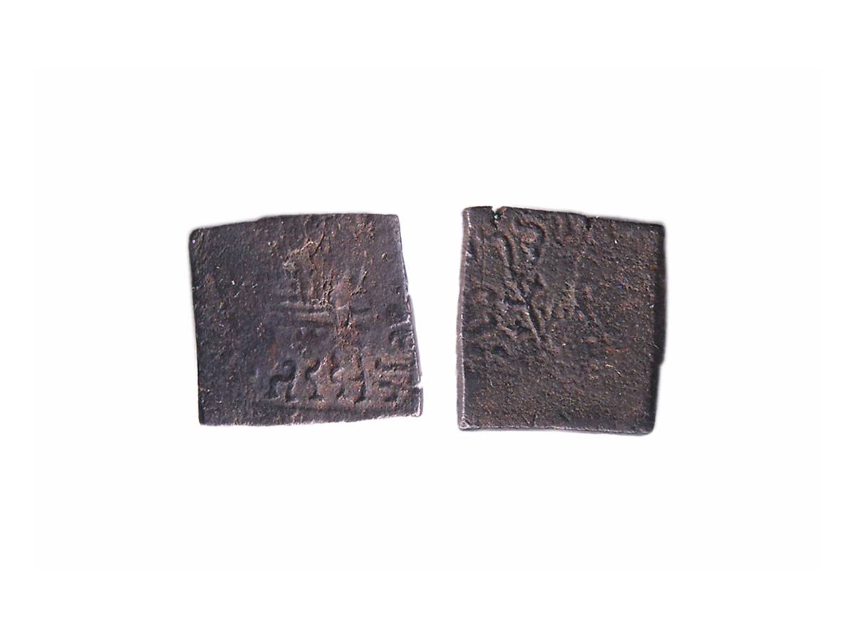 Tribe of Punjab, Audumbaras, Rudradasa (c. 200-150 BC), Copper Unit, 2.33g, Obv: Double storied temple or stupa, trident axe on right side and traces of Brahmi legend, Rev: Tree-in-railing, Forepart of elephant facing to left side and Kharoshthi legend. ( Pieper # 1031). Very Fine+.