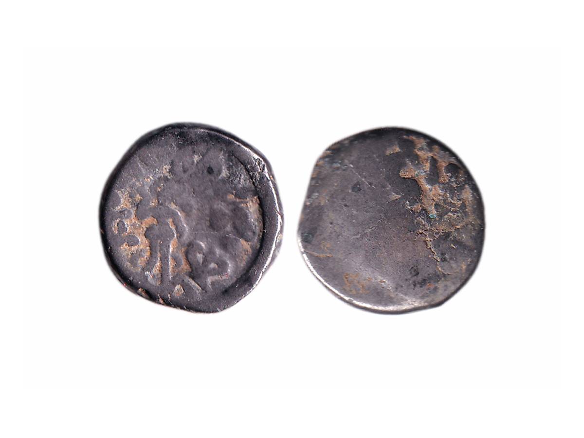 Indo-Greeks, Eukratides I (c. 171-145 BC), Silver Obol, 0.52g, Obv: Helmeted, diademed and draped bust of the ruler facing to right, Rev: Dioskouroi holding palms and spears with Greek legend 'BASILEOS EYKPATIDOY' on both sides (Bopearachchi & Rahman#257). Very Fine+.