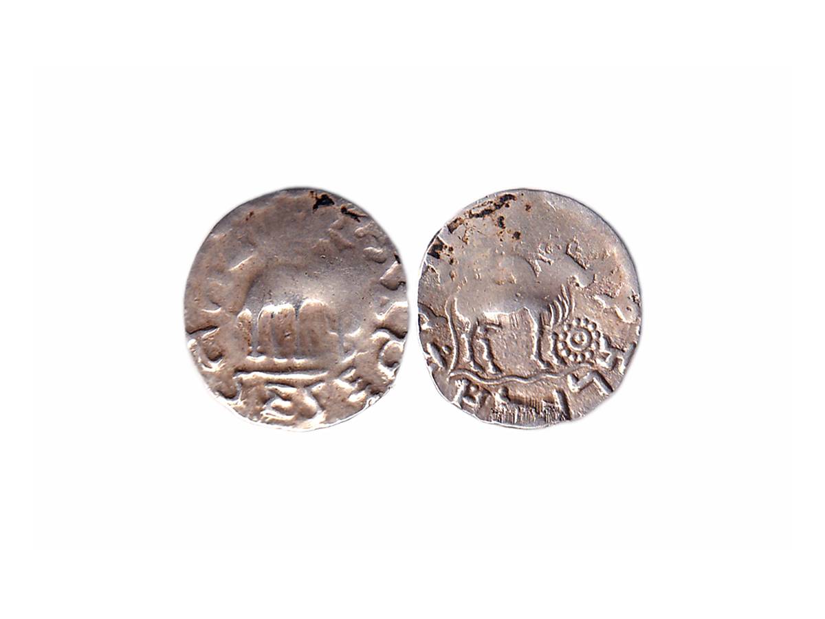 Audumbara, Trible Janapada of Paunjab region, Bhagvata Mahadeva (c. 150-100 BC), Silver Drachma, 2.26g, Obv: Elephant standing on platform facing to right side with trunk upraised, trident-battle axe standard under his tusks, parasol in uplifted trunk around Brahmi legend 'Bhagvata Mahadeva', Rev: Humped bull walking to right side front of dotted circle, below wavy line and around Kharoshthi legend. (Pieper # 1251). Very Fine.