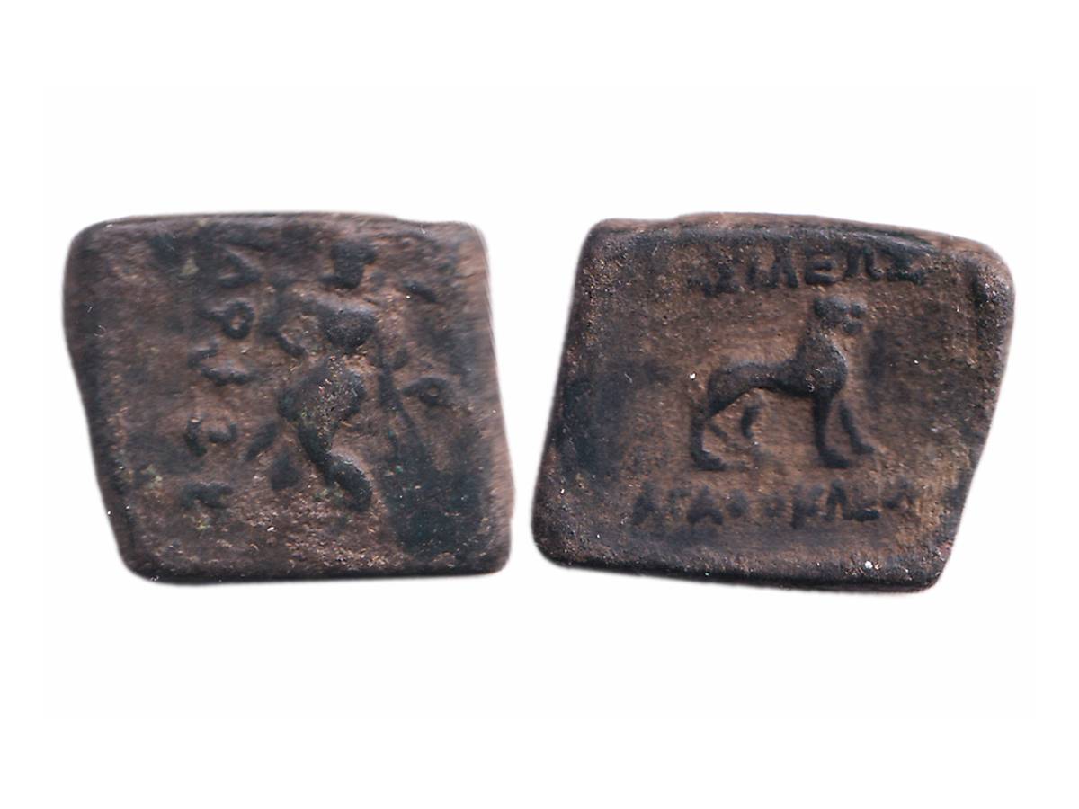Indo-Greeks, Agathocles (c. 185-170 BC), Copper Tetradrachm, 14.58g, Obv: Female deity standing facing to left side in oriental costume, holding flower in right hand and Brahmi legend Rajne Agathuklayasa on left field, Rev: Lion standing facing to right side with Greek legend BASI?EOS AGATOK?EOYS. (Bopearachchi & Rahman # 156-160). Very Fine+.