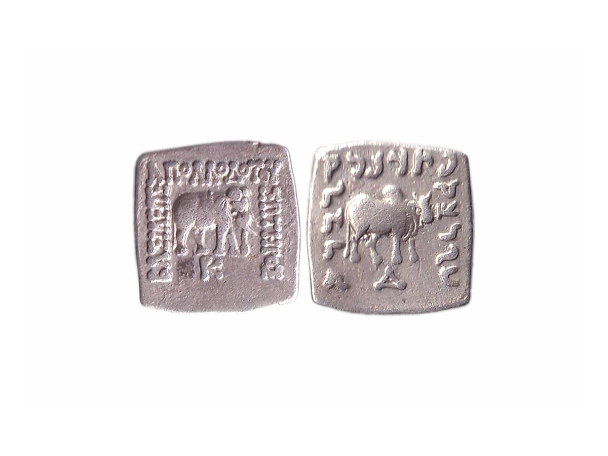 Indo-Greeks, Apollodotus I (c. 180-160 BC), Silver Square Drachms, 2.32g, Obv: Elephant walking to right with monogram and Greek legend BASILEOS APOLLODOTOY SOTHPOS three sides, Rev: Humped bull walking to right with Kharoshti legend, 'Maharajasa apaladatasa tradarasa' three sides. (Bopearachchi & Rahman # 197). Extremely Fine.