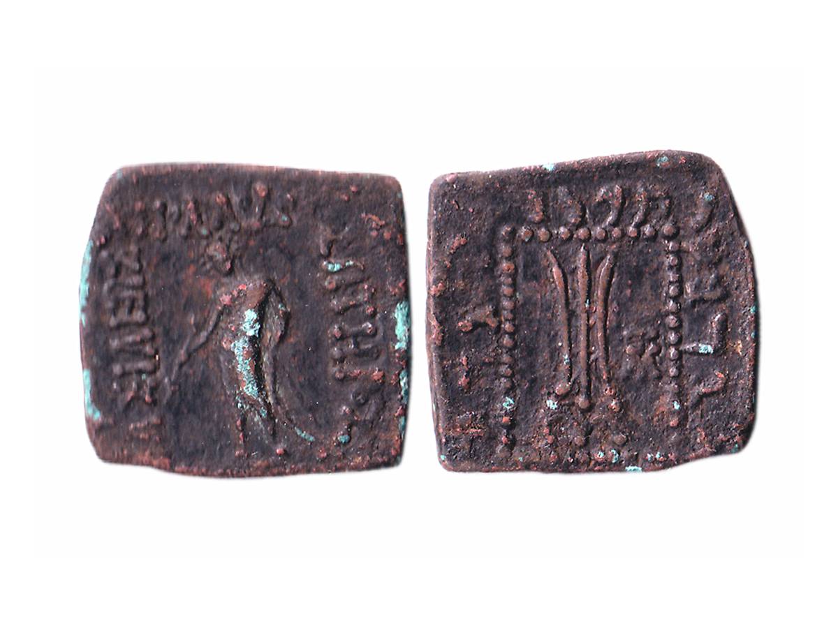 Indo-Greeks, Apollodotus I (c. 180-160 BC), Square Copper Quadruple Unit, 9.34g, Obv: Apollo standing facing left, with quiver over shoulder, holding arrow in right hand and left hand resting on grounded bow with Greek legend 'BASILEOS APOLLODOTOY SOTHPOS', Rev: Tripod within dotted square with monogram and Kharoshthi legend. (Bopearachchi & Rahman # 206). Extremely Fine.