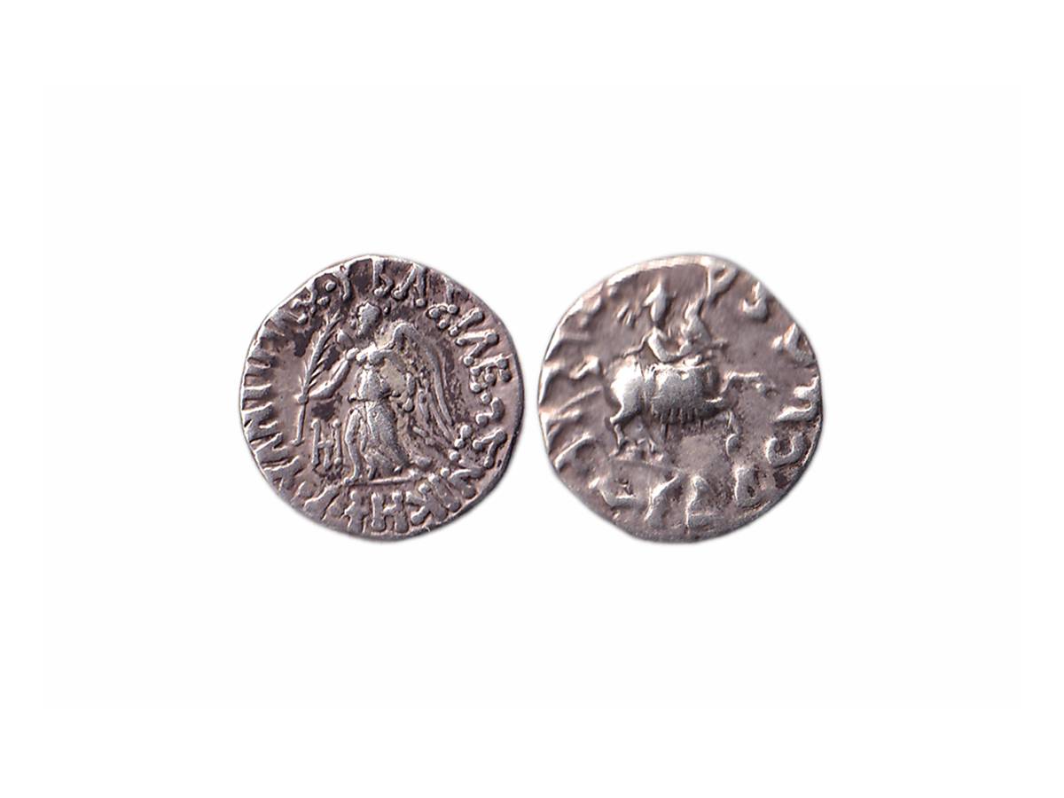 Indo-Greeks, Antimachus II (c. 174-165 BC), Silver Drachm, 2.36g, Obv: Nike standing to left, holding palm and fillet, around Greek legend around 'BASILEOS NIKHOPOY ANTIMAXOY', Rev: King on horsback prancing to right, with Kharoshti legend, 'Maharajasa Jayadharasa Amtimakasa'. (Bopearachchi & Rahman # 218). Extremely Fine+.