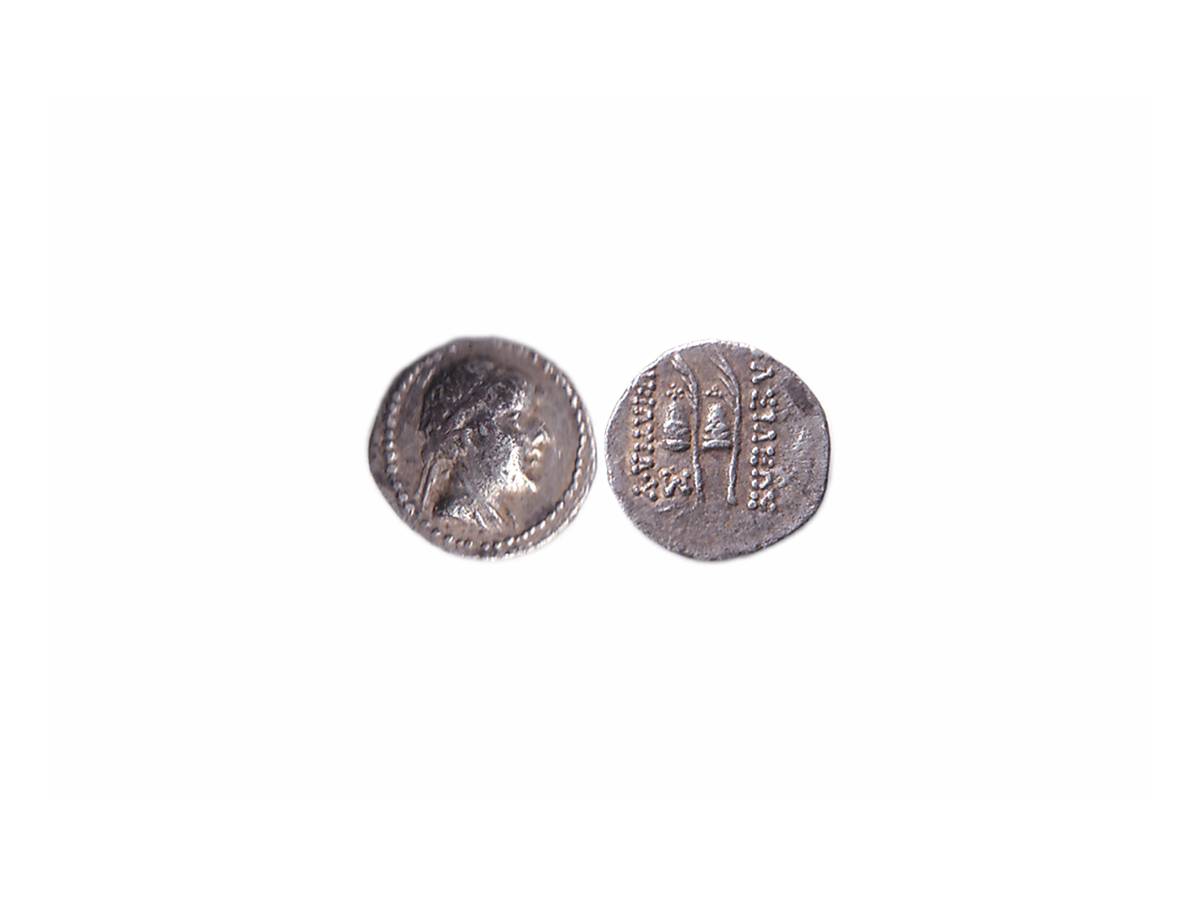 Indo-Greeks, Eukratides I (c. 171-145 BC), Silver Obol, 0.68g, Obv: Diademed bust of king facing to right side within dotted circle, Rev: Palms and pilei of Dioscuri with Greek legend 'BASILEOS EYKPATIDOY' on both sides (Bopearachchi & Rahman 238). Extremely Fine.