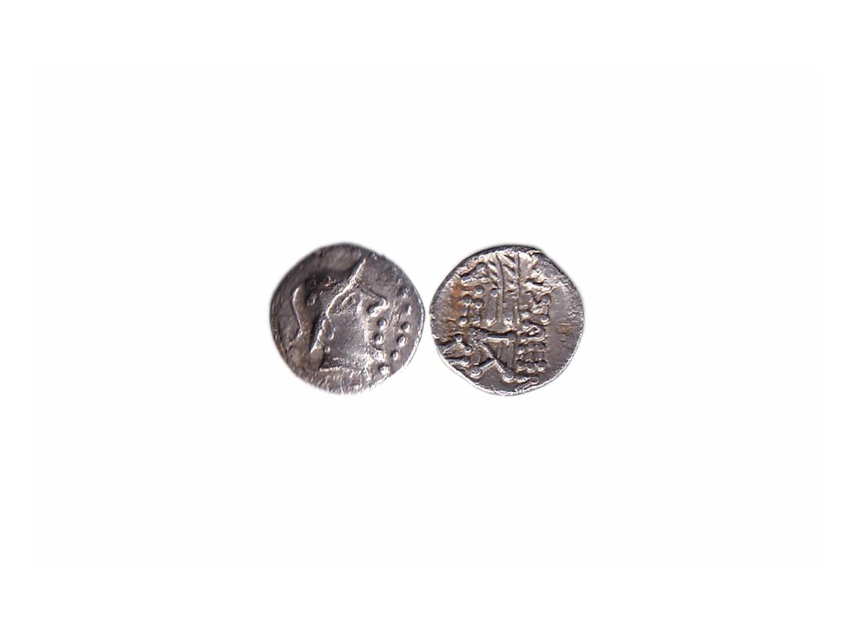 Indo-Greeks, Eukratides I (c. 171-145 BC), Silver Obol, 0.68g, Obv: Diademed bust of king facing to right side within dotted circle, Rev: Palms and pilei of Dioscuri with Greek legend 'BASILEOS EYKPATIDOY' on both sides (Bopearachchi & Rahman 238). Extremely Fine.