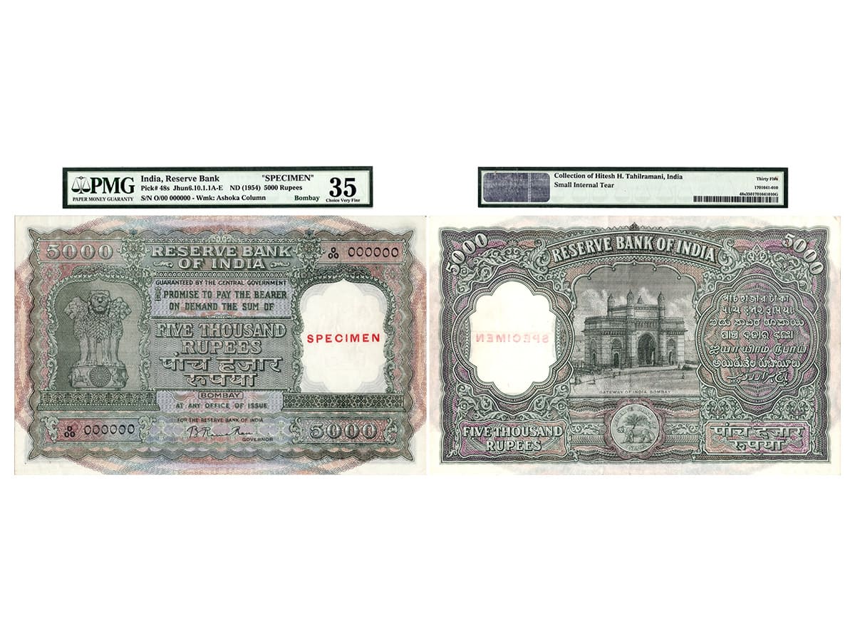 Republic of India, 5000 Rupees, Specimen Note, Signed by B RAMARAO, 1960, Prefix A, Office of Issue Bombay, Serial No A0 000000. (RR & KJ # 6.10 .2.2A). Graded by PMG, Very Fine 30.