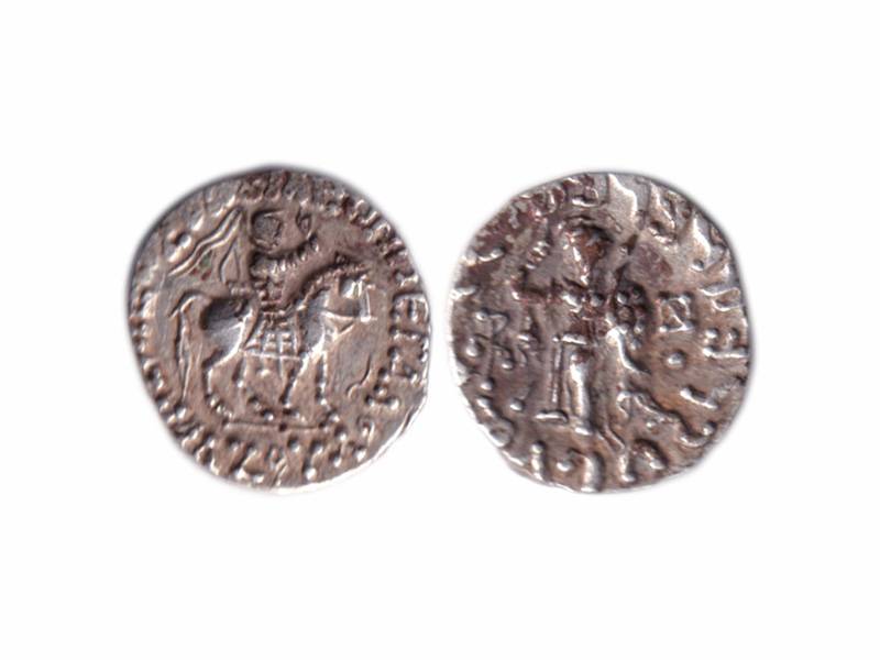 Indo Scythians, Azes I (c. 57-35 BC), Silver Drachms, 2.08g, Obv: Diademed king on horseback walking to right, around Greek legend, Rev: Female goddess standing facing to left, one hand raised, around Kharoshti legend. Extremely Fine.