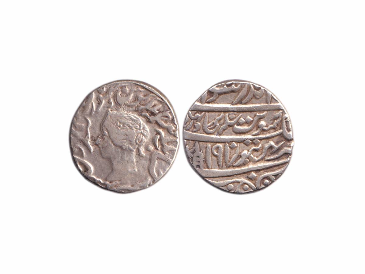 Bharatpur, Jaswant Singh (AH 1269-1311 / 1853-1893 AD), Silver Rupee, 11.07g, Brajendrapur Mint, VS 1910, in the name of Victoria, Obv: Profile bust of the Queen wearing a coronet in centre; Farsi legend Malika Mu'azzamah Farman Rawaye Inglistan, Katar symbol as mint mark on rev. (KM # 156). Very Fine.