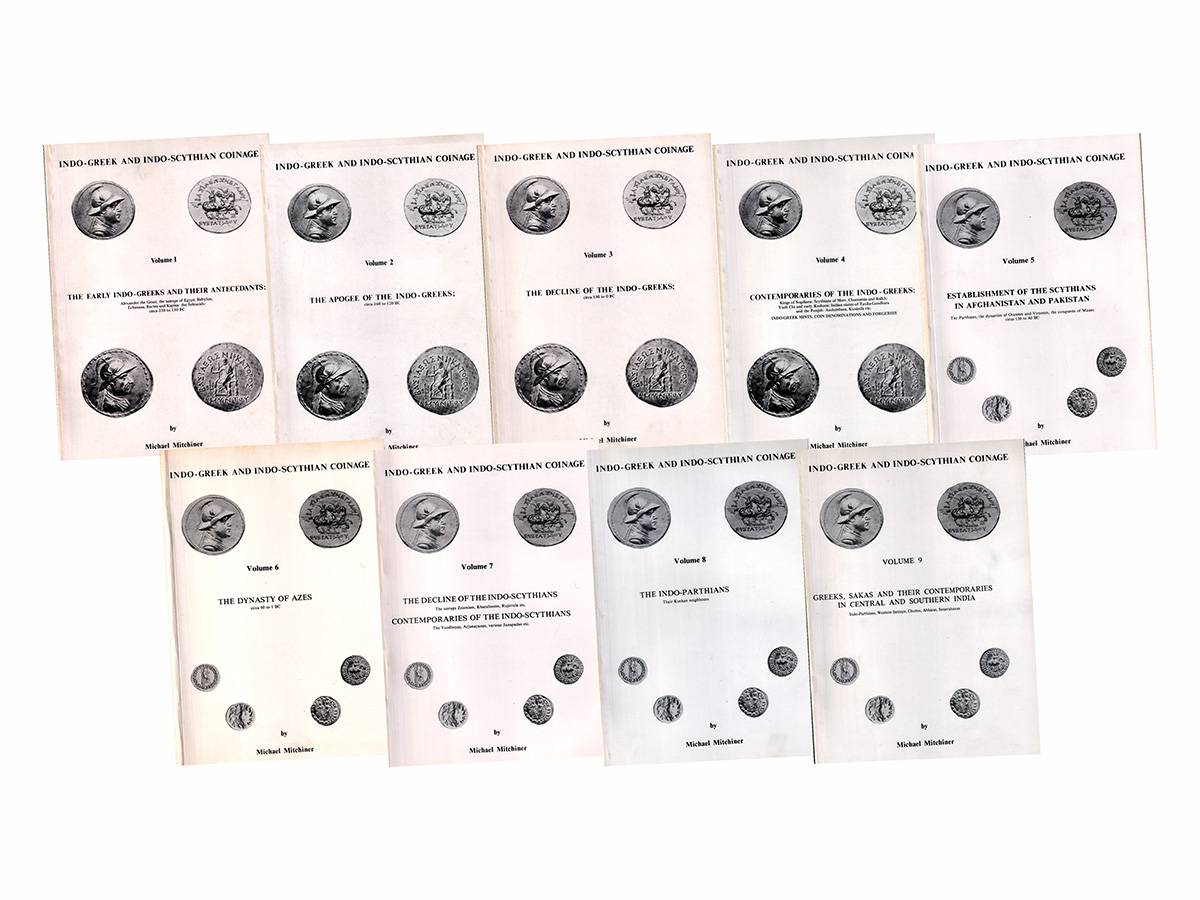 Indo Greek and Indo Scythian Coinage, set of 9 Volumes, Written by Michael Mitchiner, All Volumes Have Coins Plates, Published in 1975, All Volumes are Out of Print, One of the Best for Indo Greek and Indo Scythian Coin Collectors, Excellent Condition.